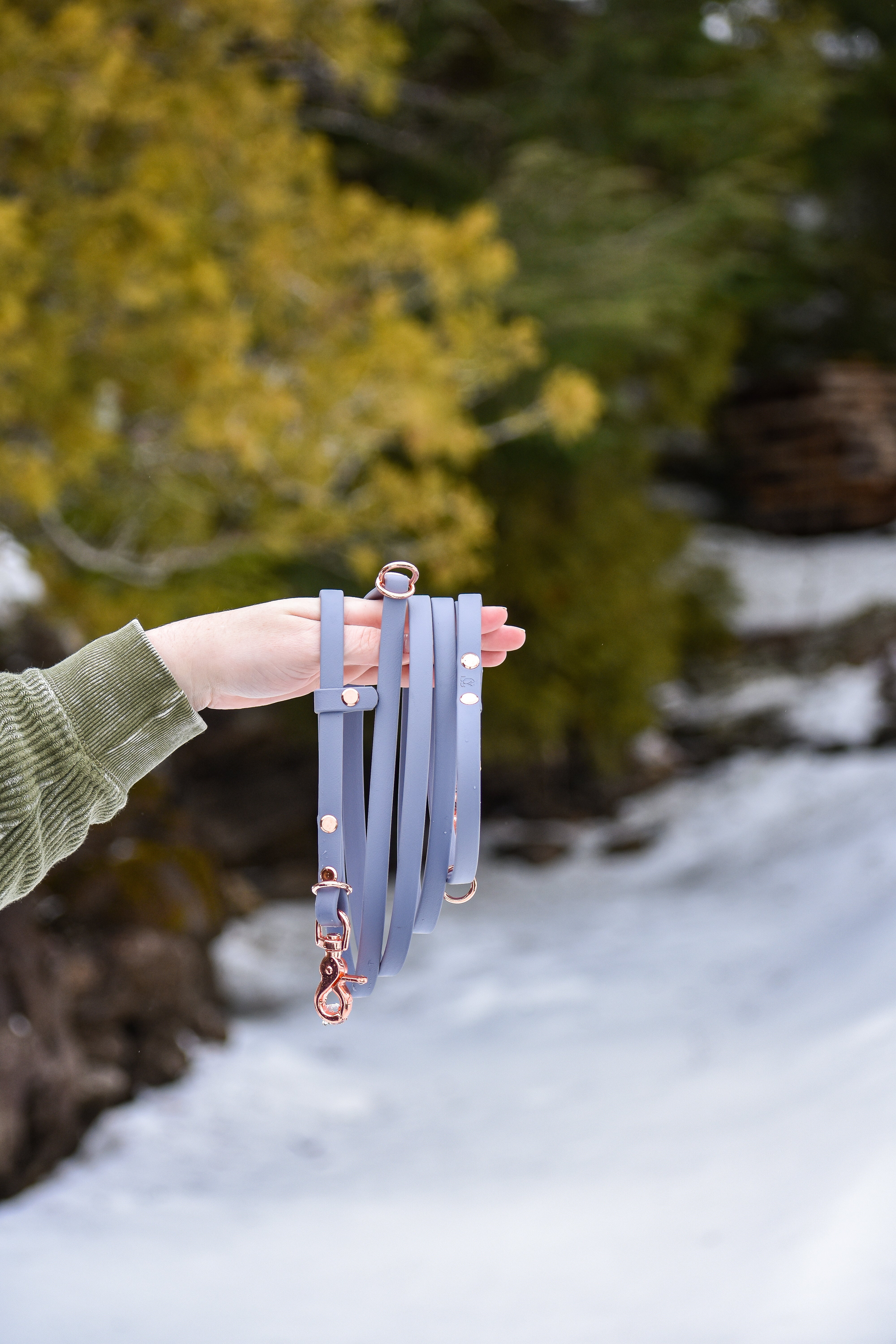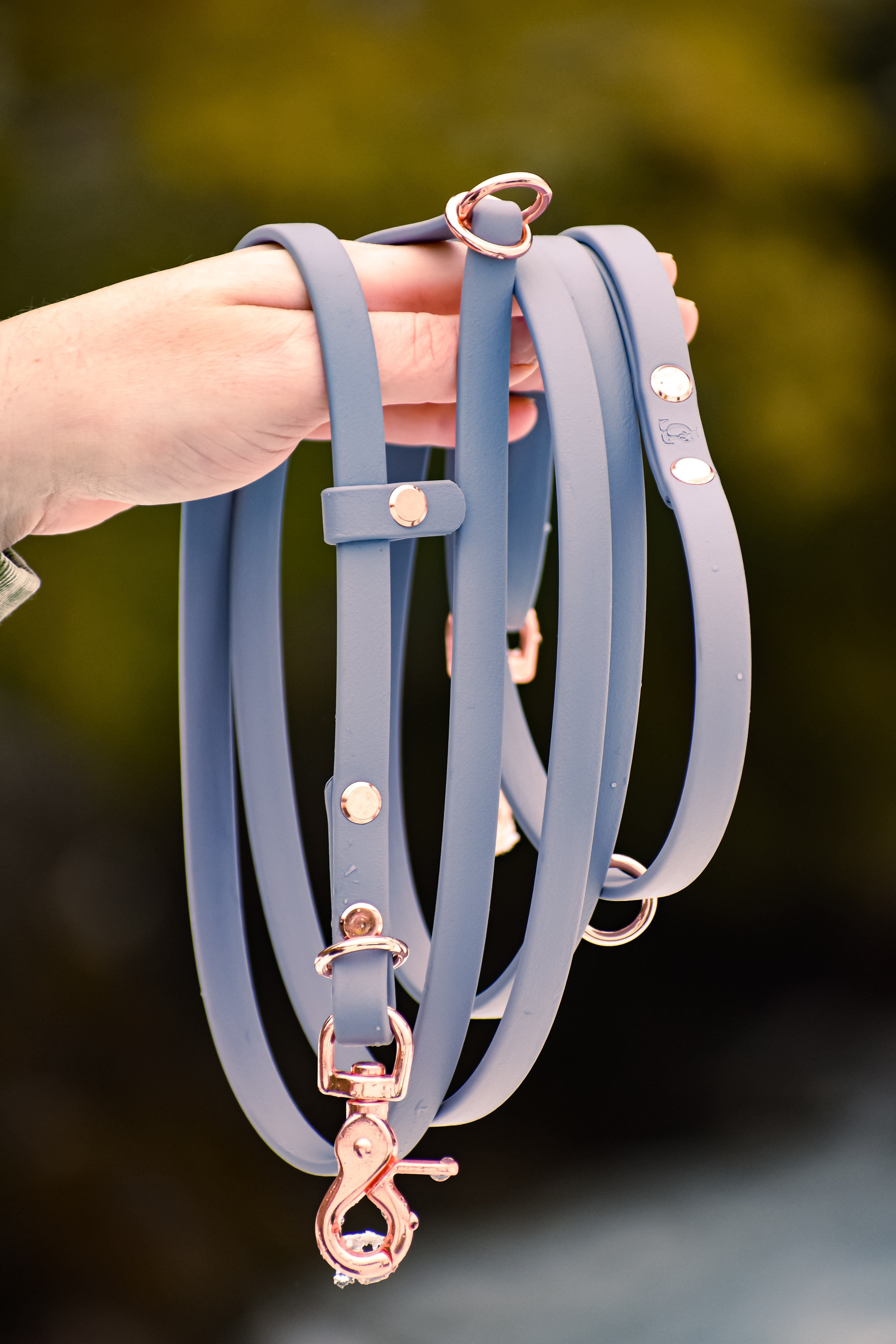 8-10: Pastel Blue multiway leash with rose gold hardware and trigger snap ends.