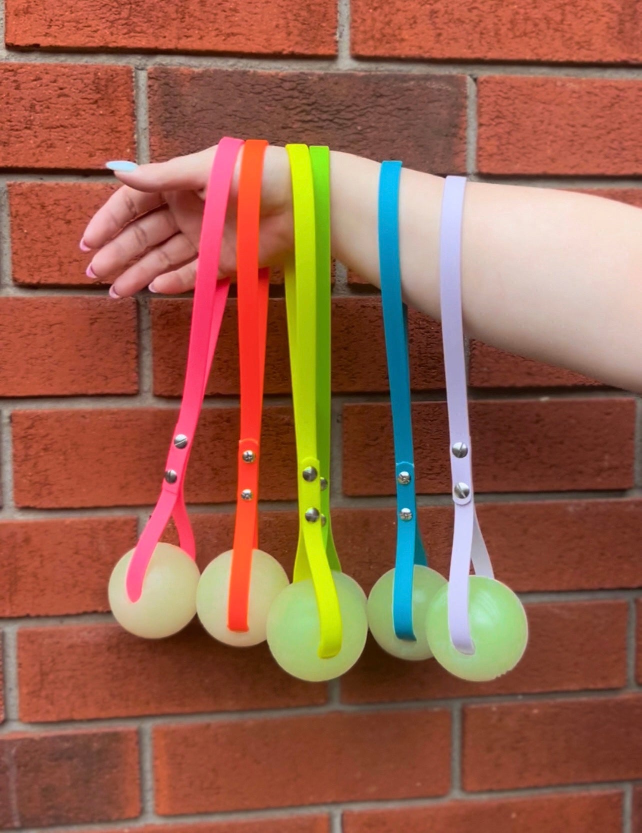 - King Chew Glow N Dark Ball tugs with rivets and loop ends. Colors as seen left to right: Hot Pink, Citrus, Highlighter, Green Apple, Lagoon, Lavender.