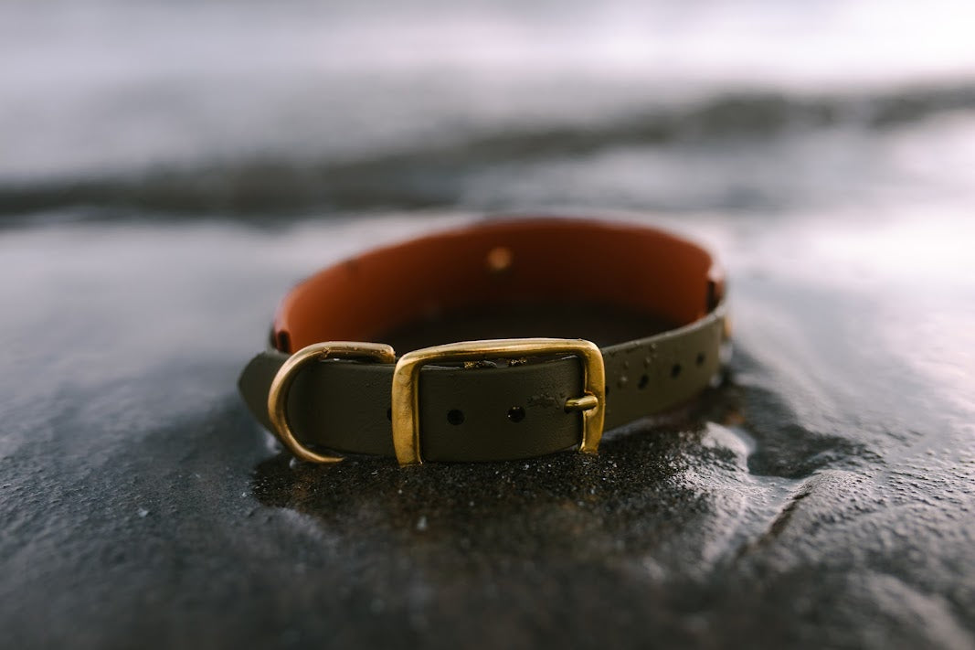 Photos 2-3: 1.5” Secondary & 1” Primary Layered collar with Solid Brass hardware and no strap keeper. The Primary colour is Olive and the Secondary colour is Caramel.