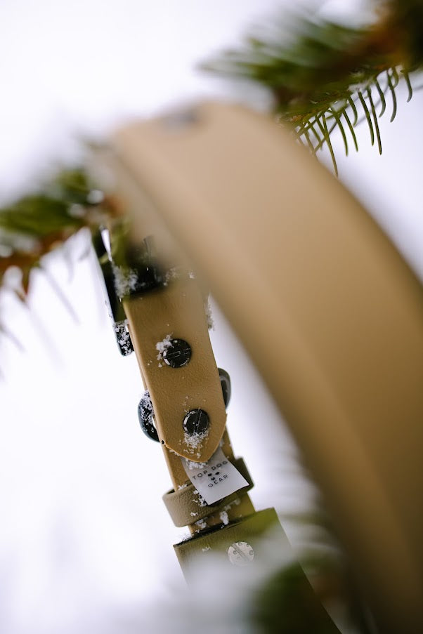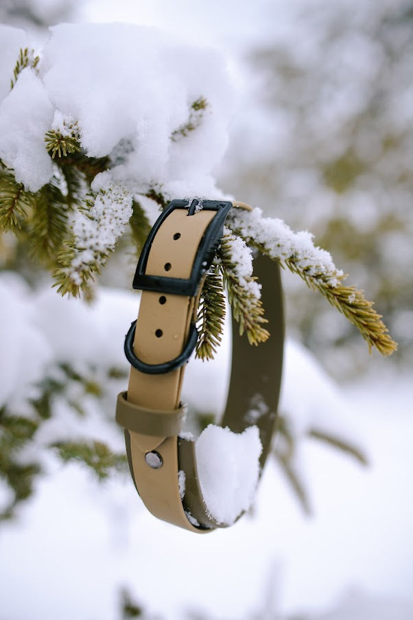 Photos 4-6: 1.5” Secondary & 1” Primary Layered collar with Black hardware and a strap keeper. The Primary colour is Sahara and the Secondary colour is Olive.